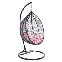 FOTEL OGRODOWY WISZĄCY KOKON DUŻY KOSZ KORFU CZARNY Z PODSTAWĄ PODUSZKA RÓŻOWE KWIATY