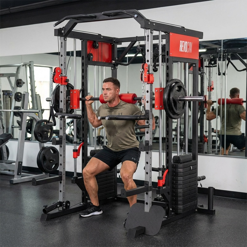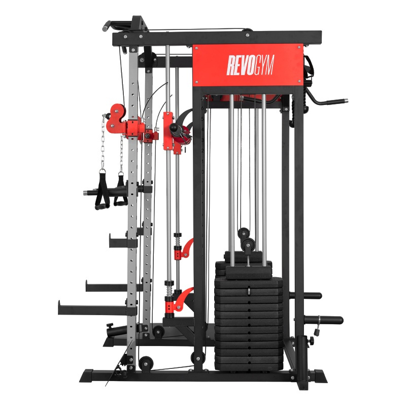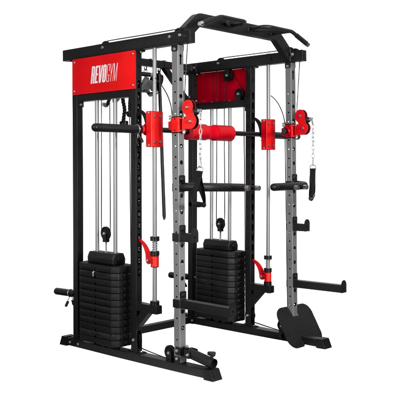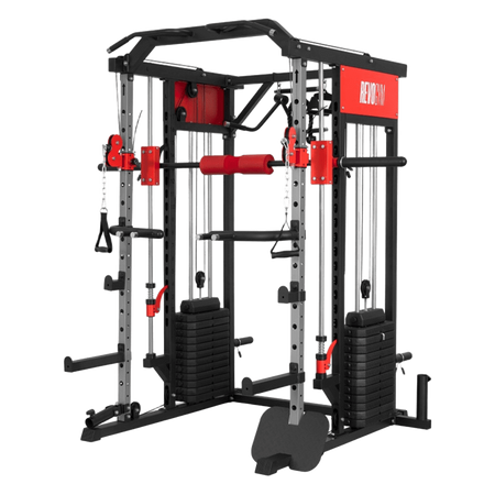 Atlas treningowy RevoGym to profesjonalne centrum treningowe typu "wszystko w jednym", zaprojektowane, aby sprostać oczekiwaniom najbardziej wymagających użytkowników. Jest to hybrydowa konstrukcja łącząca w sobie zalety suwnicy Smitha, bramy z dwoma niezależnymi wyciągami oraz stacji do treningu z masą własnego ciała. Wykonany z masywnych, grubych profili stalowych, gwarantuje bezkompromisową stabilność i bezpieczeństwo. To idealne rozwiązanie dla osób, które chcą zbudować kompletną, domową siłownię o komercyjnej jakości, oszczędzając przy tym cenną przestrzeń.