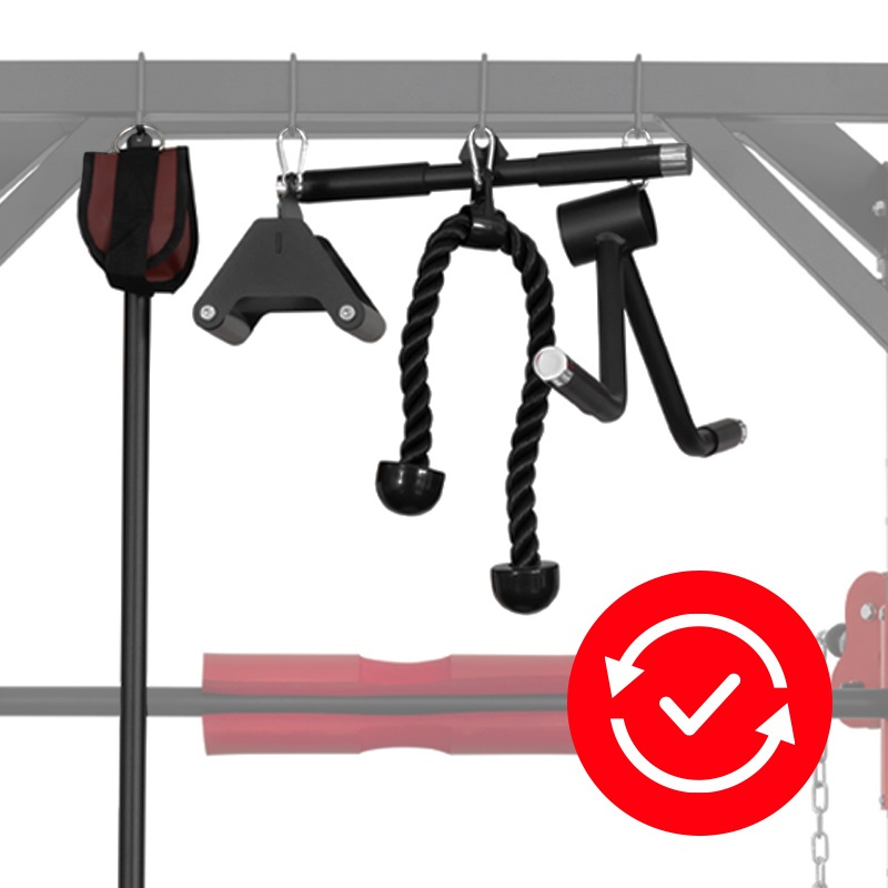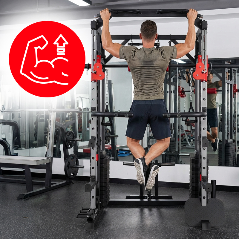 Urządzenie wyposażono w wielochwytowy drążek do podciągania, który pozwala na angażowanie mięśni pleców i ramion pod różnymi kątami. W zestawie znajdują się również solidne, demontowalne poręcze do dipów (pompek na poręczach), co czyni atlas kompletnym narzędziem również do zaawansowanego treningu kalistenicznego.