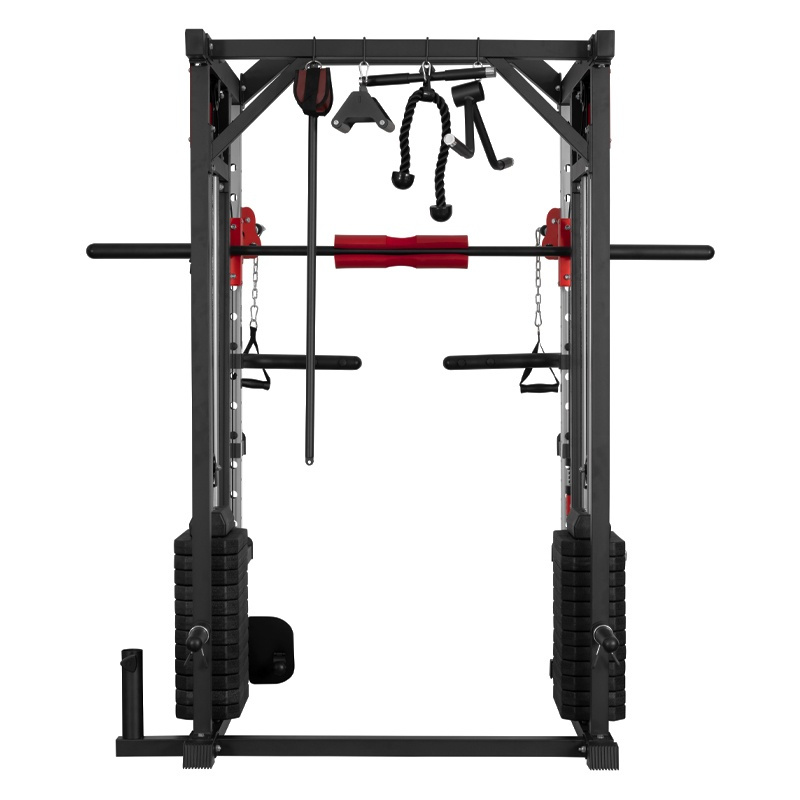 Zintegrowana suwnica z płynnie działającym mechanizmem pozwala na bezpieczne wykonywanie ciężkich ćwiczeń, takich jak przysiady czy wyciskanie na ławce, bez potrzeby asekuracji partnera. Wbudowany system haków asekuracyjnych na całej długości prowadnic gwarantuje możliwość natychmiastowego zablokowania sztangi w dowolnym momencie, minimalizując ryzyko kontuzji.