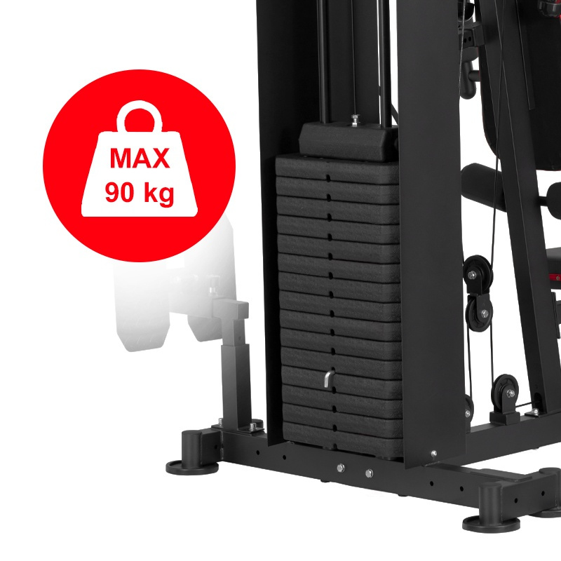 Duży, 90-kilogramowy stos pozwala na wykonywanie progresywnego treningu siłowego przez długi czas. Jest to idealne rozwiązanie zarówno dla osób początkujących, które mogą zaczynać od minimalnego ciężaru, jak i dla zaawansowanych użytkowników, którym zapas obciążenia pozwoli na stały rozwój siły i masy mięśniowej.