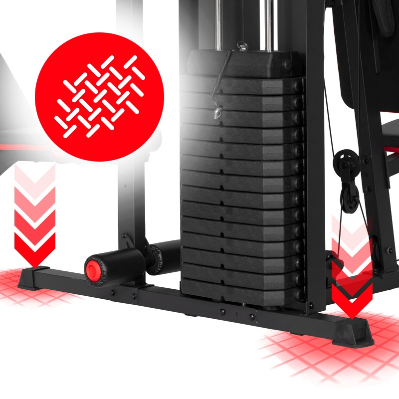 Wysoka waga urządzenia w połączeniu z szeroką podstawą gwarantuje maksymalną stabilność nawet podczas dynamicznych ćwiczeń z pełnym obciążeniem. Grube profile stalowe oraz częściowa, metalowa osłona stosu zapewniają bezpieczeństwo i wieloletnią trwałość konstrukcji.