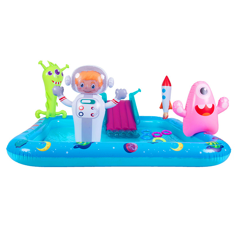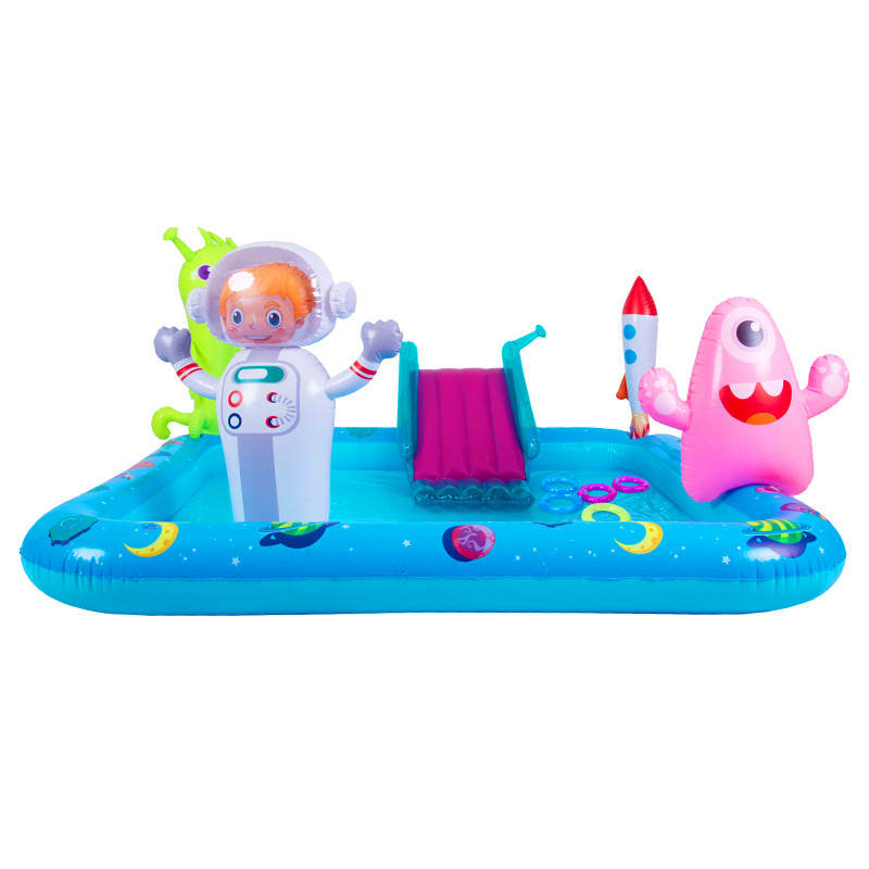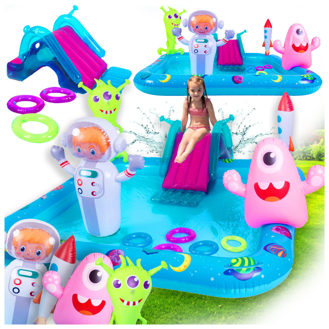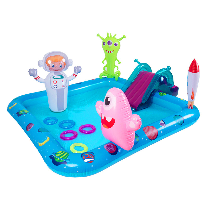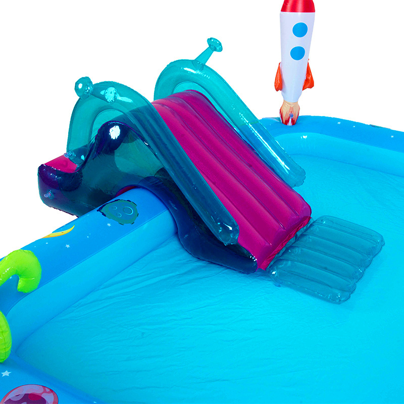 Połączenie płytkiego brodzika, zjeżdżalni i zestawu nadmuchiwanych dekoracji sprawia, że produkt pełni funkcję kompaktowego centrum rozrywki. Dzięki temu dzieci mają dostęp do różnorodnych aktywności w jednym miejscu, bez potrzeby korzystania z dodatkowych zabawek.