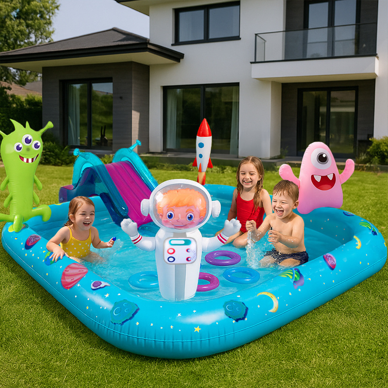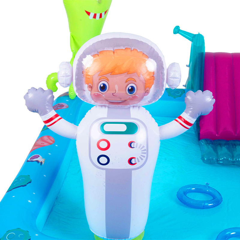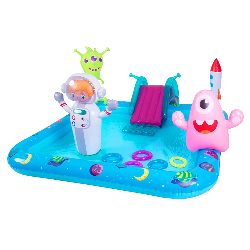 Dmuchany basen SPACE to wszechstronny zestaw wodny, zaprojektowany z myślą o najmłodszych użytkownikach, który doskonale sprawdzi się jako atrakcja w ogrodzie, na działce czy tarasie. Produkt łączy funkcje płytkiego basenu, zjeżdżalni oraz zestawu kolorowych zabawek, tworząc interaktywną przestrzeń do zabawy i relaksu. Dzięki kompaktowym wymiarom (240 × 200 cm) oraz przemyślanej, bezpiecznej konstrukcji, plac zabaw SPACE zapewnia dziecku komfortowe warunki do pierwszych kontaktów z wodą. Całość wykonana jest z wytrzymałego PVC odpornego na ścieranie i przebicia, co pozwala na długotrwałe użytkowanie nawet w warunkach intensywnej eksploatacji. Motyw przewodni produktu – świat kosmosu – został przedstawiony w sposób atrakcyjny wizualnie i przyjazny dzieciom. Dzięki temu basen nie tylko pełni funkcję użytkową, ale również wspiera rozwój wyobraźni i zachęca do aktywności fizycznej na świeżym powietrzu. To idealne rozwiązanie dla rodziców, którzy chcą zapewnić dzieciom bezpieczną alternatywę dla publicznych kąpielisk i jednocześnie stworzyć warunki do zabawy bez konieczności opuszczania domu.