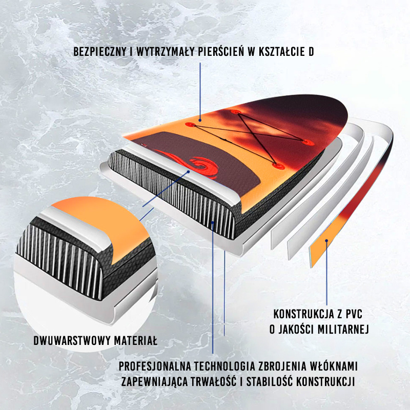 Całość wykonana została z trwałych, odpornych na uszkodzenia materiałów. Zastosowanie nowoczesnych technologii, takich jak łączenie termiczne i rdzeń I-Drop Stitch, zapewnia wysoką sztywność konstrukcji przy zachowaniu niskiej wagi. Estetyczne wykończenie z trwałym nadrukiem podnosi walory wizualne i wydłuża żywotność produktu.
