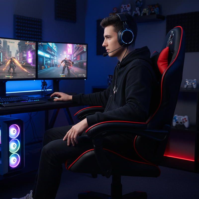 Siedzisko i oparcie tego fotela są pokryte solidną skórą PVC o grubości 0,8 mm, co nie tylko nadaje mu elegancki wygląd, ale także zapewnia wysoką trwałość oraz prostotę w czyszczeniu. Taki wybór materiału gwarantuje, że fotel będzie służył przez długie lata, zachowując swój pierwotny urok bez znacznego zużycia. Dodatkowo, łatwość w utrzymaniu czystości skóry PVC pozwala na szybkie usuwanie zabrudzeń, co jest szczególnie ważne w intensywnie użytkowanych przestrzeniach, takich jak gamingowe czy biurowe.