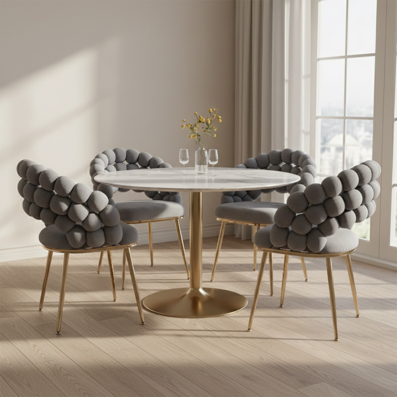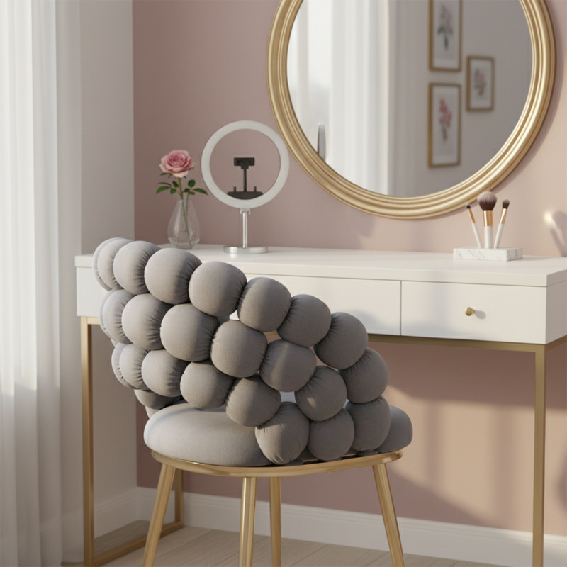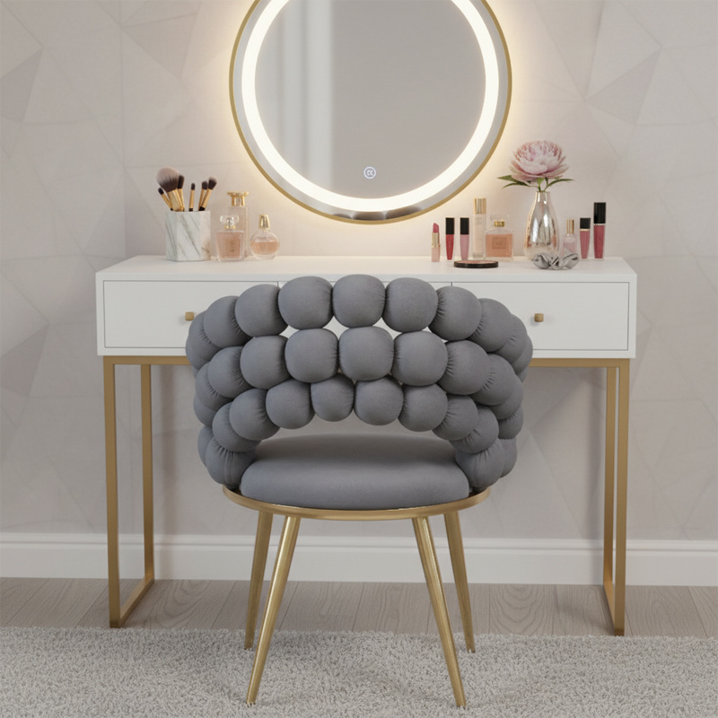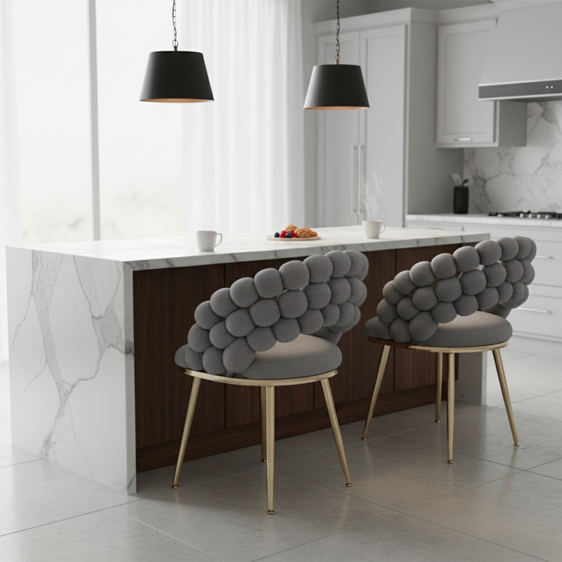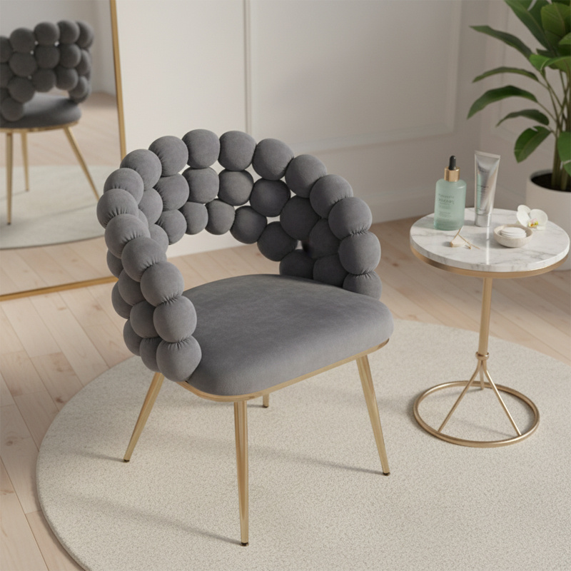 Fotel ATRIA – nowoczesna elegancja i komfort w designerskiej formie. Dodaj swojemu wnętrzu elegancji i charakteru dzięki wyjątkowemu krzesłu ATRIA, tapicerowanemu miękkim welurem i wyróżniającemu się oryginalnym designem oraz starannie dopracowaną formą. Oparcie wykonane z miękkich, kulistych modułów z pianki natywnej nie tylko przyciąga wzrok, ale także gwarantuje niezwykły komfort podczas siedzenia. Aksamitna tkanina welurowa o gramaturze 295 g/m² zachwyca subtelnym połyskiem i zmiennością odcienia pod wpływem dotyku, tworząc przytulną i luksusową atmosferę. Stabilne, metalowe nogi dodają konstrukcji nowoczesnego charakteru i zapewniają trwałość na lata. To krzesło to doskonały wybór zarówno do wnętrz mieszkalnych – salonu, sypialni, toaletki czy garderoby – jak i przestrzeni komercyjnych takich jak showroomy, salony piękności czy poczekalnie. To harmonijne połączenie stylu, wygody i trwałości.