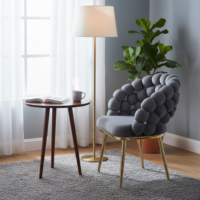 Oparcie w formie splecionych, miękkich kul przyciąga wzrok i dodaje wnętrzu unikalnego charakteru.