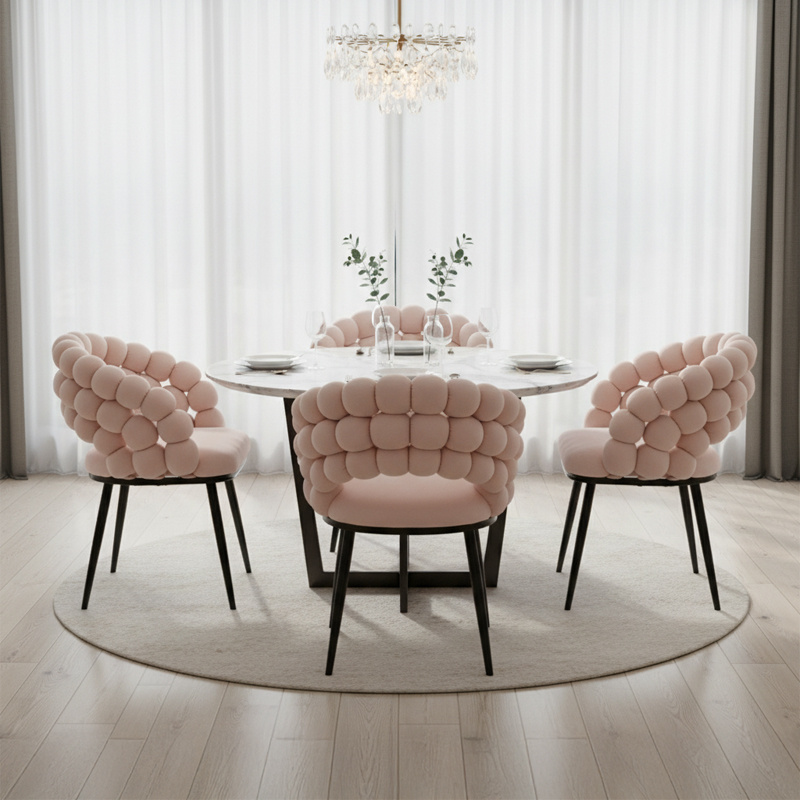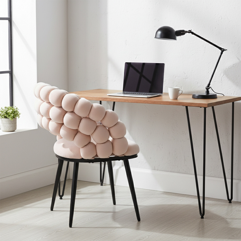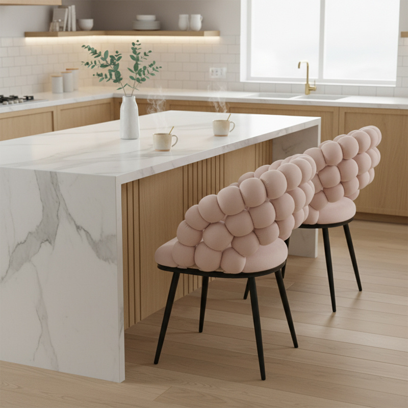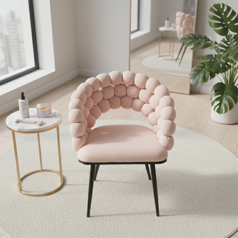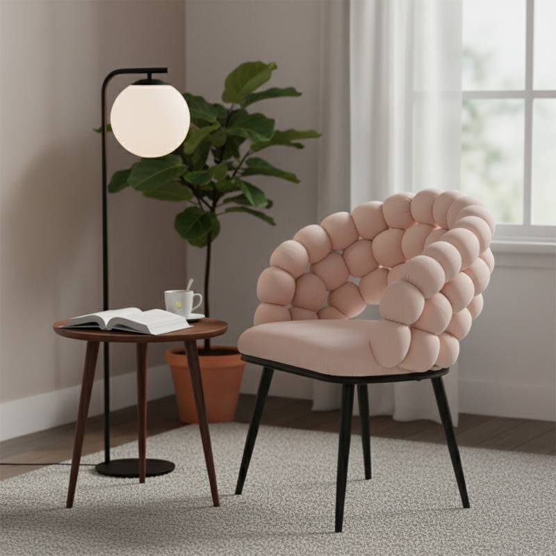 Oparcie w formie splecionych, miękkich kul przyciąga wzrok i dodaje wnętrzu unikalnego charakteru.