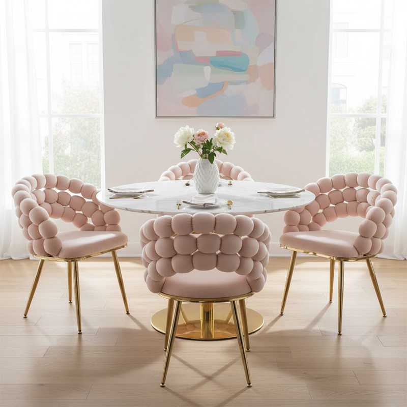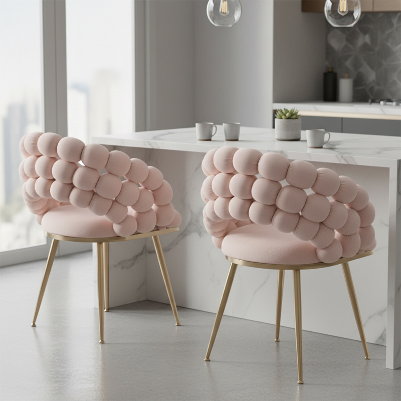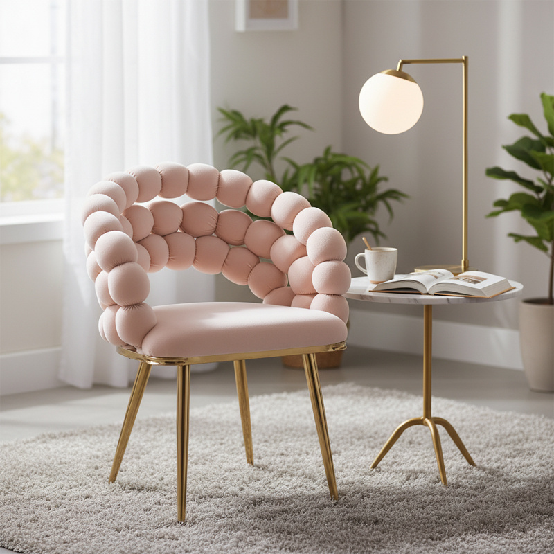 Oparcie w formie splecionych, miękkich kul przyciąga wzrok i dodaje wnętrzu unikalnego charakteru.