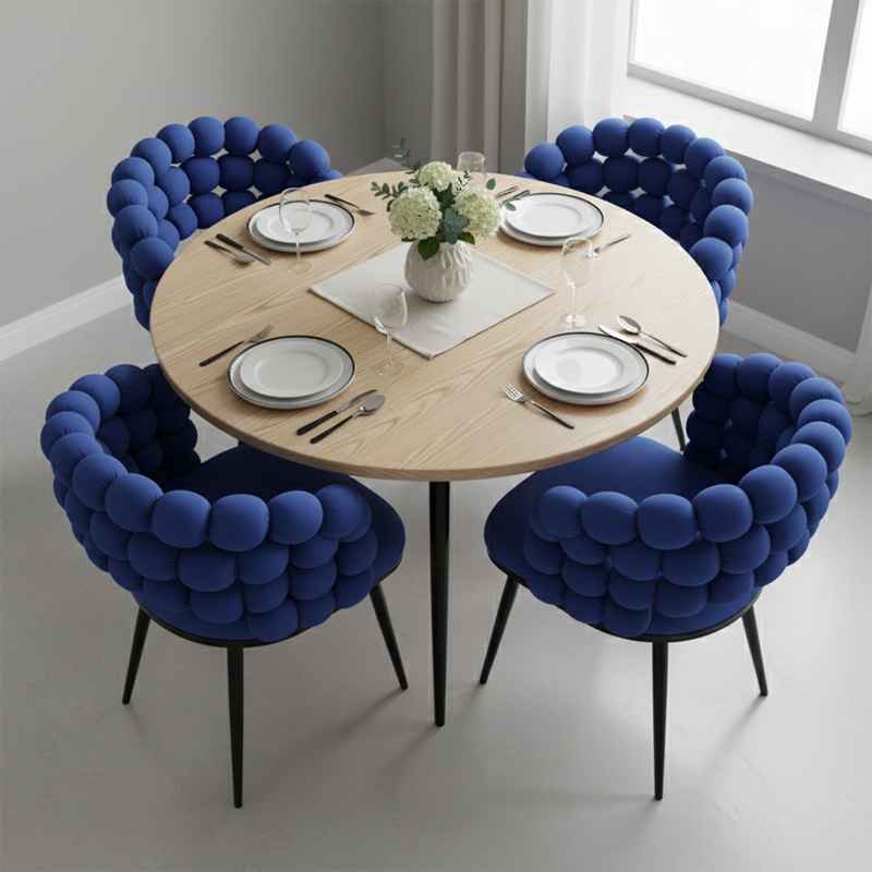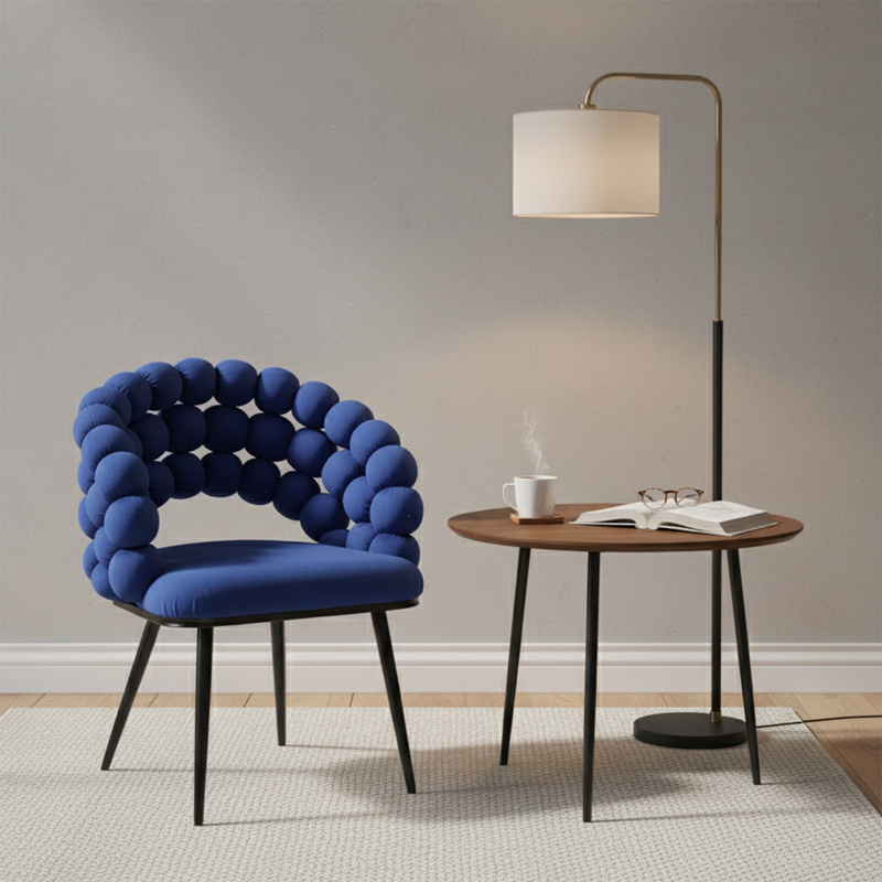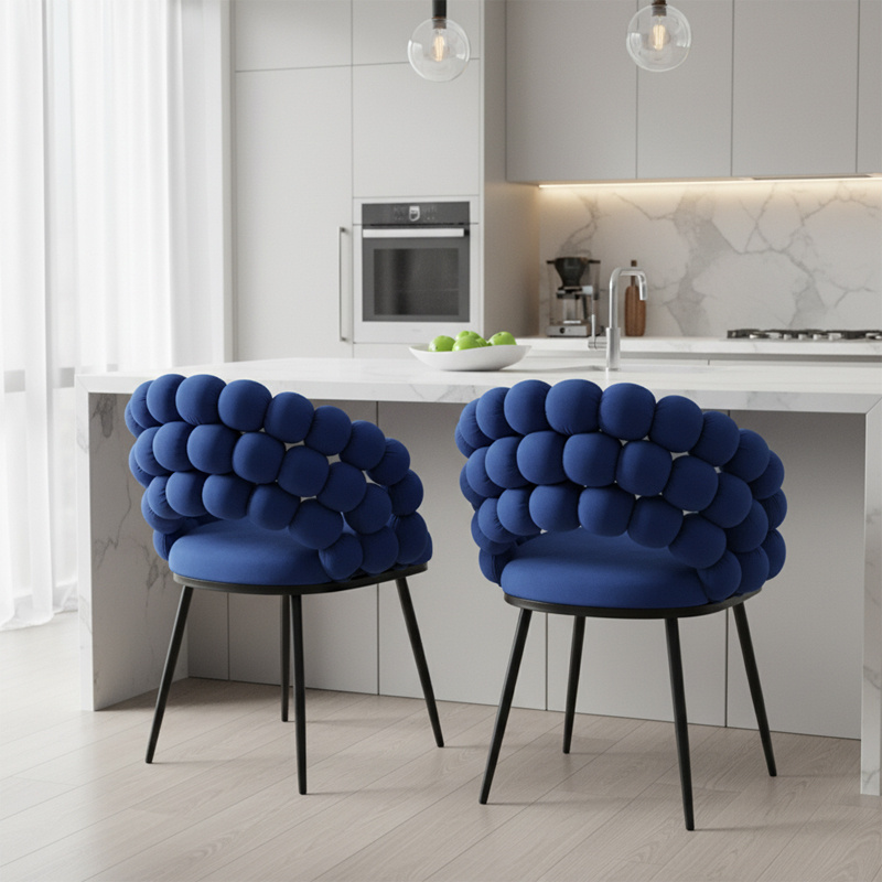 Oparcie w formie splecionych, miękkich kul przyciąga wzrok i dodaje wnętrzu unikalnego charakteru.