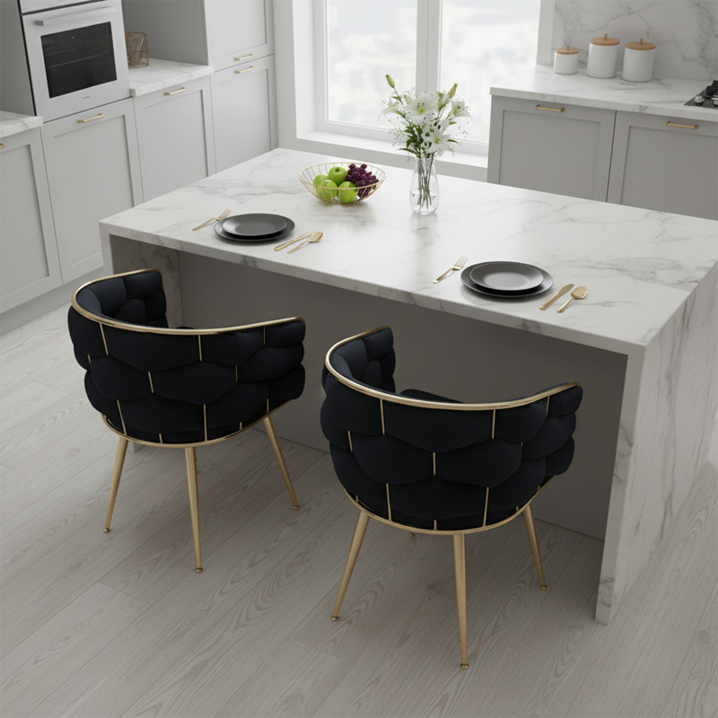 Fotel wyróżnia się oryginalnym splotem tkaniny na oparciu, co nadaje mu niepowtarzalny, designerski charakter. Doskonale komponuje się z wnętrzami urządzonymi w stylu nowoczesnym i glamour, stanowiąc wyrazisty akcent estetyczny w każdej aranżacji.