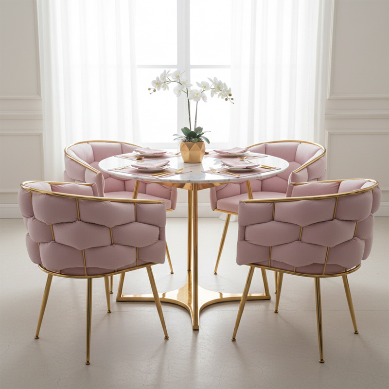 Fotel wyróżnia się oryginalnym splotem tkaniny na oparciu, co nadaje mu niepowtarzalny, designerski charakter. Doskonale komponuje się z wnętrzami urządzonymi w stylu nowoczesnym i glamour, stanowiąc wyrazisty akcent estetyczny w każdej aranżacji.