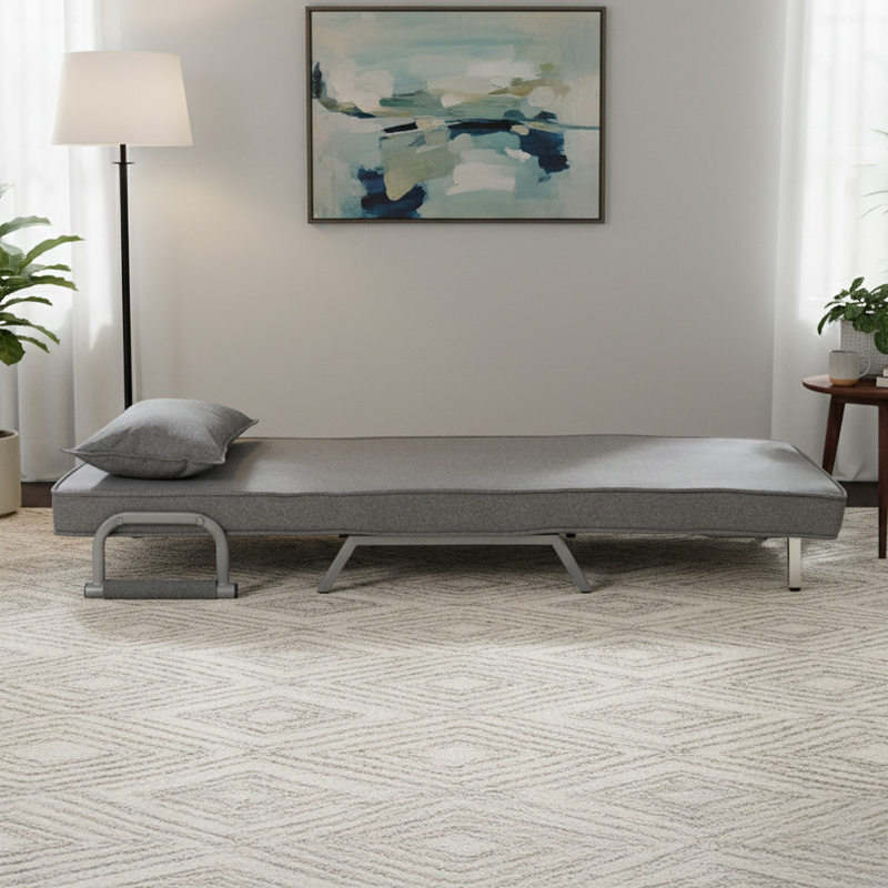 Fotel składany Velaco to idealne rozwiązanie dla osób ceniących wygodę, estetykę oraz praktyczne podejście do urządzania wnętrz. Tapicerowany wysokiej jakości tkaniną, odporną na ścieranie i mechacenie, prezentuje się elegancko i nowocześnie, a jednocześnie jest łatwy w utrzymaniu czystości. Największym atutem tego modelu jest możliwość rozłożenia fotela do pozycji leżącej, co pozwala na jego wykorzystanie jako łóżka - idealnego dla jednej osoby. Dzięki temu mebel doskonale sprawdzi się w mniejszych mieszkaniach, pokojach młodzieżowych, gościnnych, a także w przestrzeniach wypoczynkowych. Wypełnienie z elastycznej pianki gwarantuje wygodę zarówno podczas siedzenia, jak i snu, natomiast solidna metalowa konstrukcja zapewnia stabilność i trwałość na co dzień. Dodatkowego uroku nadają fotelowi srebrnoszare nogi, które w subtelny sposób podkreślają jego nowoczesny charakter.