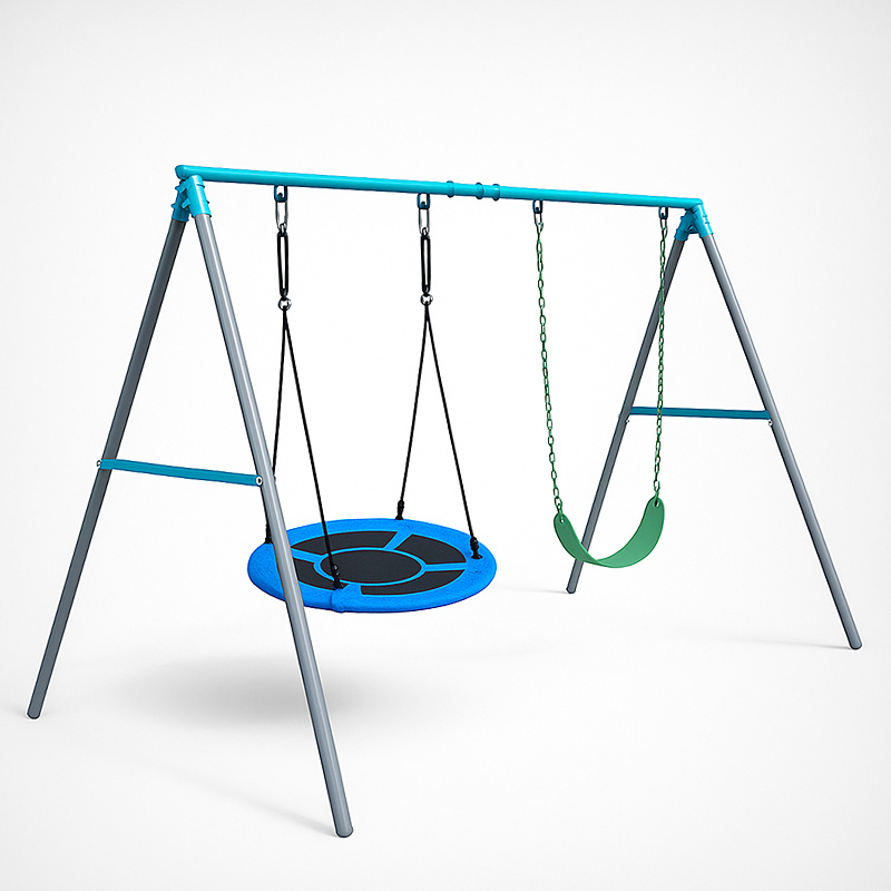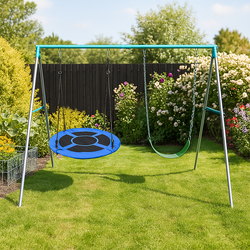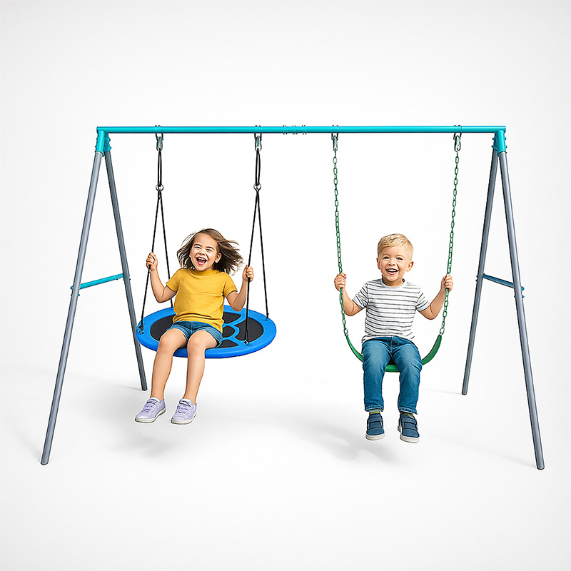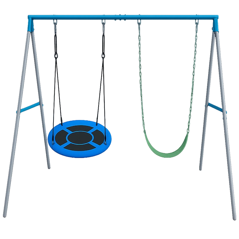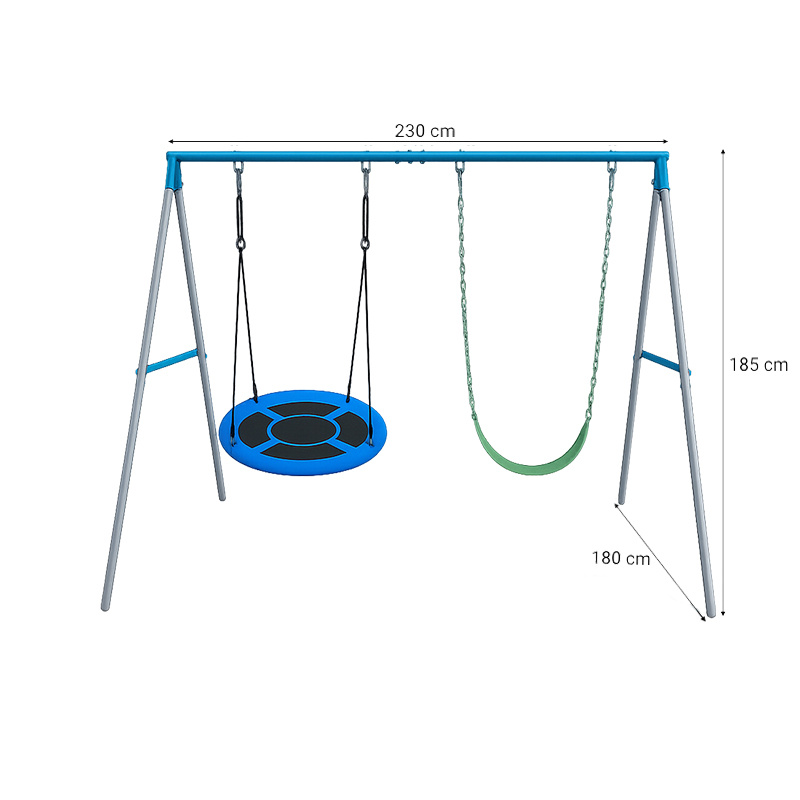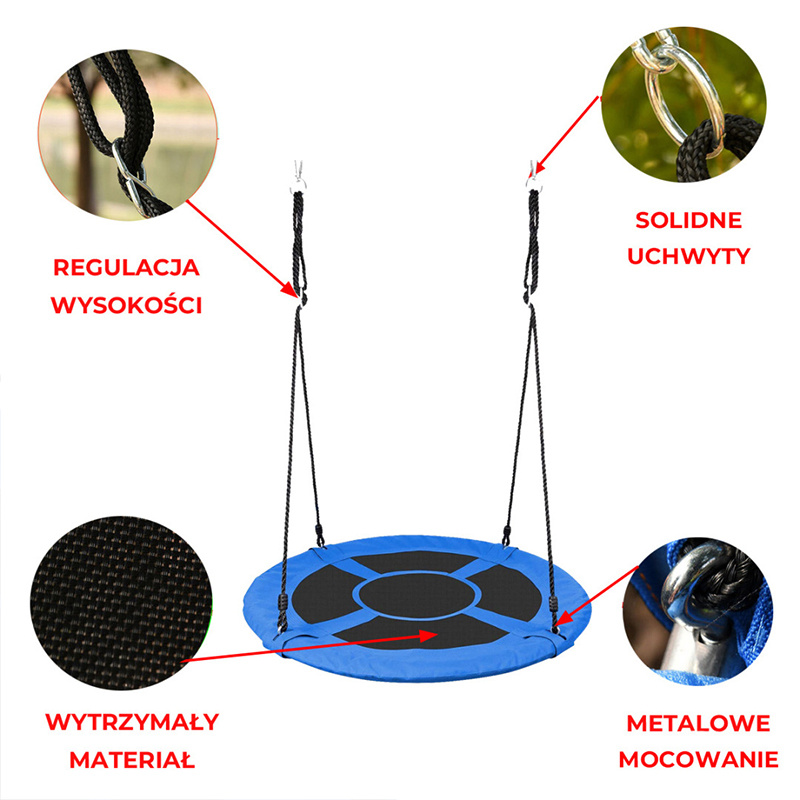 Stabilna konstrukcja wykonana z grubych, stalowych profili gwarantuje dużą wytrzymałość i odporność na intensywną zabawę. Zestaw został zaprojektowany z myślą o maksymalnym bezpieczeństwie użytkowników – jego nośność wynosi aż 300 kg, co pozwala na komfortowe korzystanie z kilku elementów jednocześnie. Zarówno klasyczne siedzisko, jak i bocianie gniazdo zawieszone są na mocnych, plecionych linach, które zapewniają trwałość i niezawodność w każdych warunkach. Wszystkie komponenty zostały starannie dopracowane, aby zapewnić dzieciom bezpieczną i beztroską zabawę w ogrodzie.