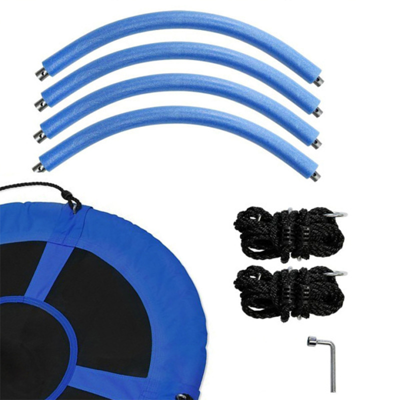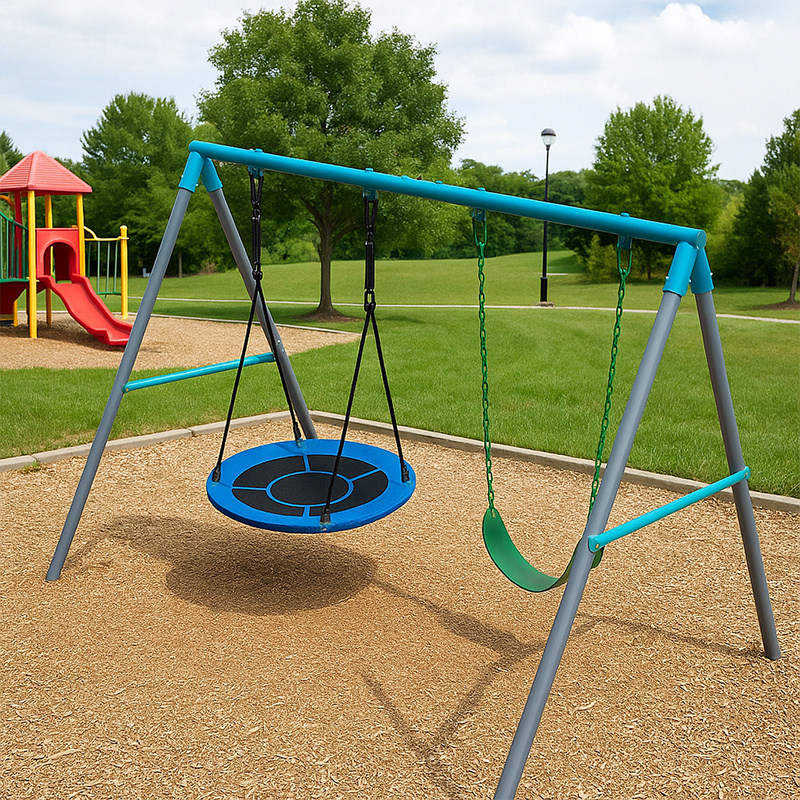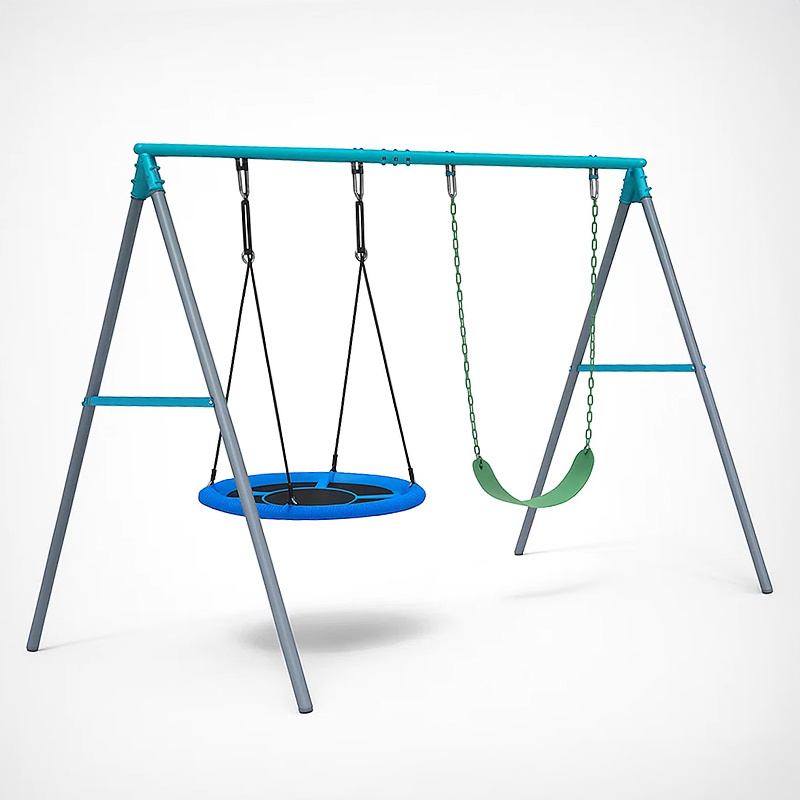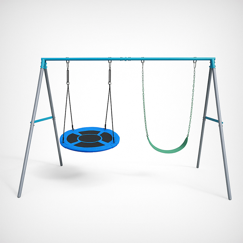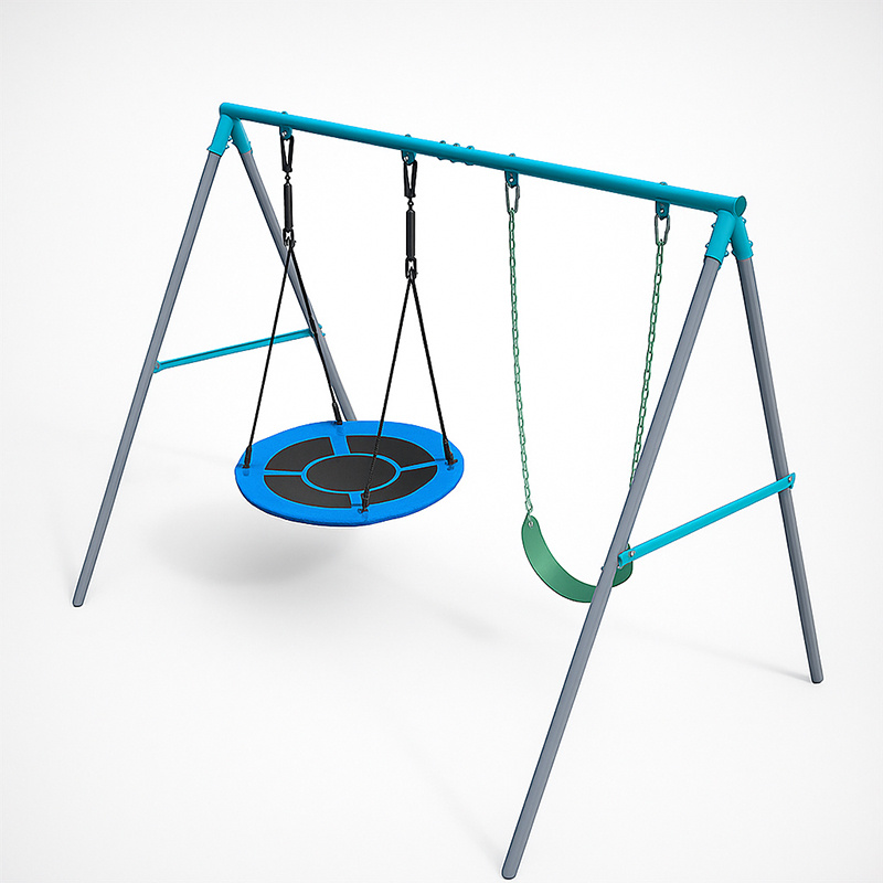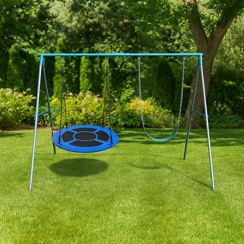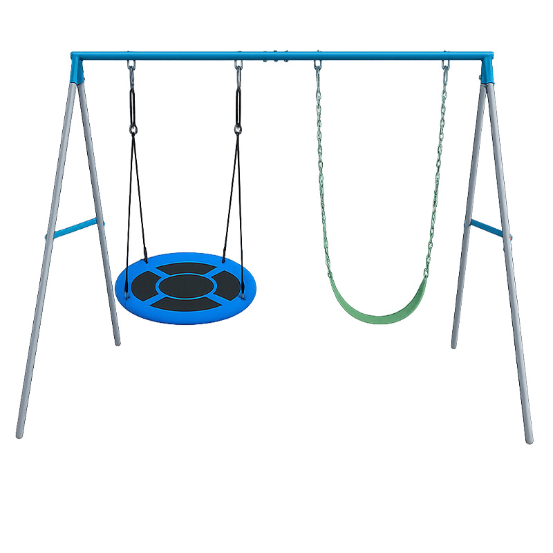 Stabilna konstrukcja wykonana z grubych, stalowych profili gwarantuje dużą wytrzymałość i odporność na intensywną zabawę. Zestaw został zaprojektowany z myślą o maksymalnym bezpieczeństwie użytkowników – jego nośność wynosi aż 300 kg, co pozwala na komfortowe korzystanie z kilku elementów jednocześnie. Zarówno klasyczne siedzisko, jak i bocianie gniazdo zawieszone są na mocnych, plecionych linach, które zapewniają trwałość i niezawodność w każdych warunkach. Wszystkie komponenty zostały starannie dopracowane, aby zapewnić dzieciom bezpieczną i beztroską zabawę w ogrodzie.