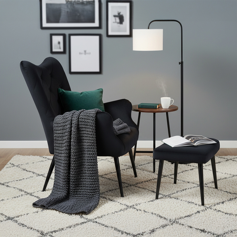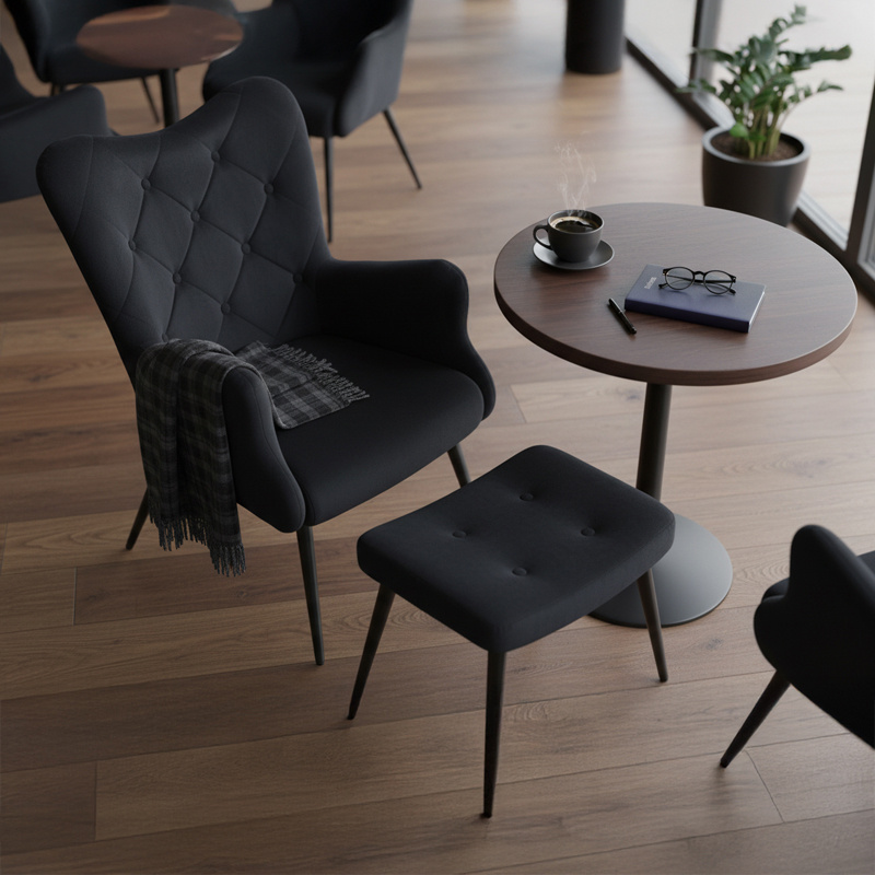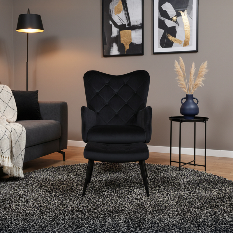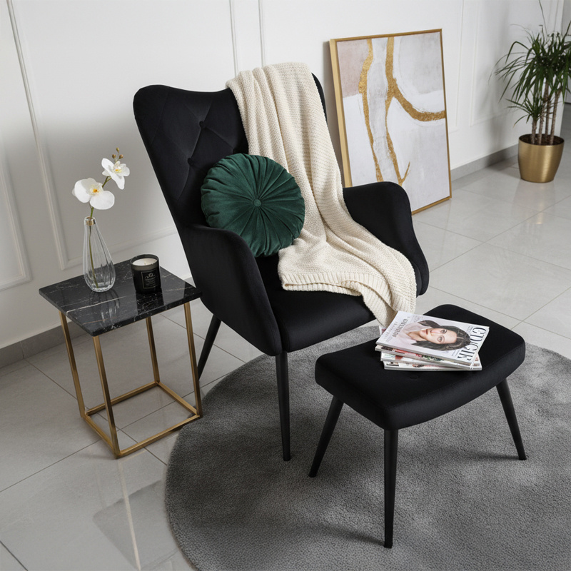 KRZESŁO FOTEL WELUROWY TAPICEROWANY Z PODNÓŻKIEM MARS CZARNY NOGI CZARNE