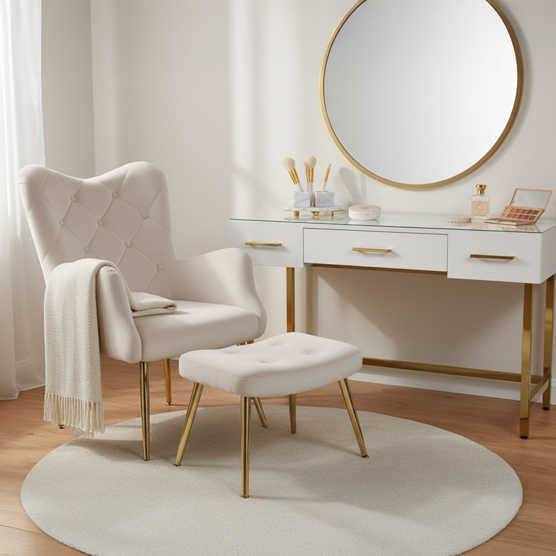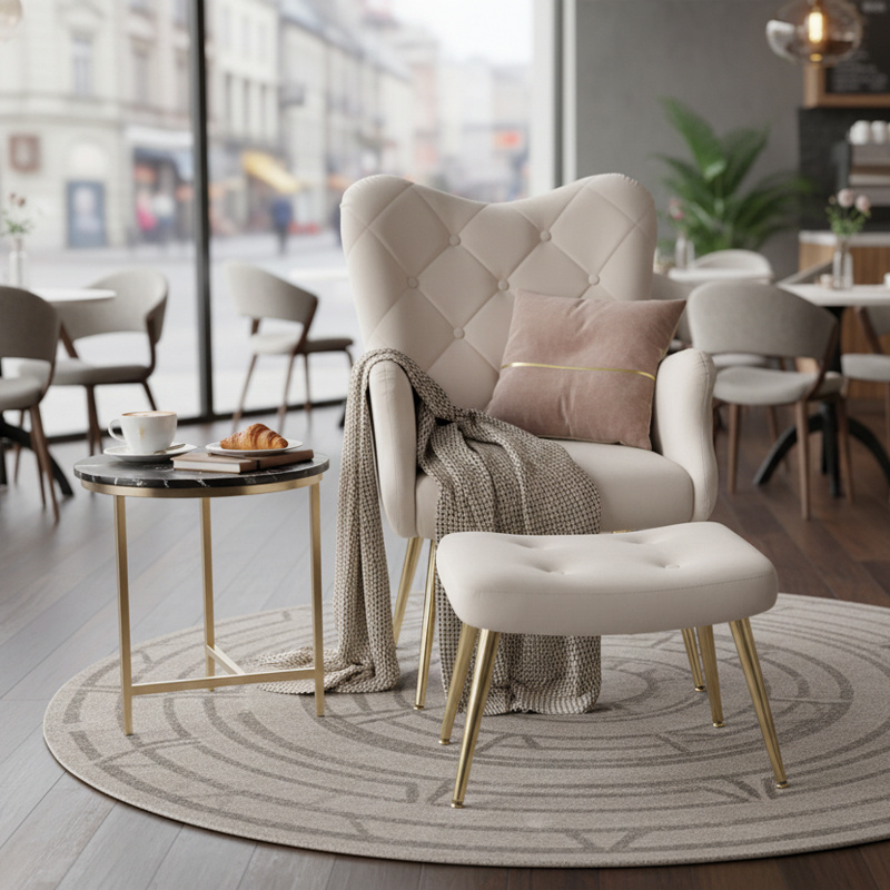 KRZESŁO FOTEL WELUROWY TAPICEROWANY Z PODNÓŻKIEM MARS ECRU NOGI ZŁOTE