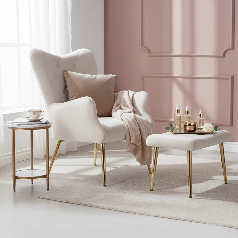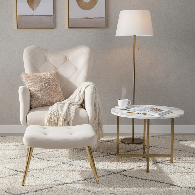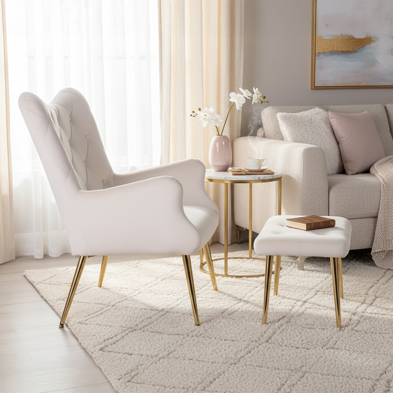 Fotel welurowy Velaco to połączenie stylu, wygody i wysokiej jakości wykonania. Jego elegancki design przyciąga uwagę, doskonale komponując się zarówno z nowoczesnymi, jak i klasycznymi aranżacjami wnętrz. Pikowane oparcie w harmonijnej kolorystyce nadaje pomieszczeniu luksusowy charakter. Miękka, welurowa tkanina jest przyjemna w dotyku, a szerokie, głębokie siedzisko zapewnia wyjątkowy komfort nawet podczas długiego użytkowania. Oparcie wspiera kręgosłup, umożliwiając pełny relaks. Zestaw uzupełnia miękki podnóżek, który podnosi komfort użytkowania, tworząc idealne miejsce do odpoczynku po długim dniu. Solidny, metalowy stelaż gwarantuje stabilność i trwałość, a jego złote wykończenie doskonale współgra z elegancką tapicerką, dodając wnętrzu klasy i wyrafinowania. To idealny wybór dla osób ceniących wygodę, estetykę i jakość wykonania.