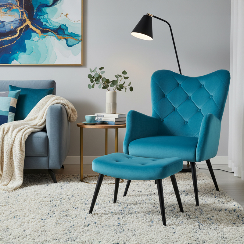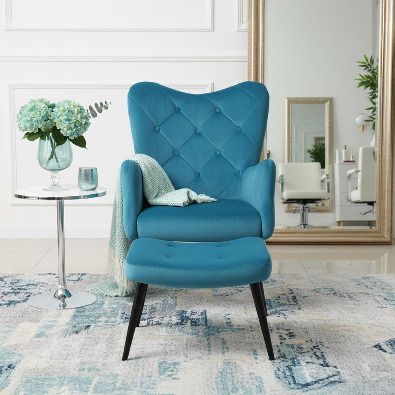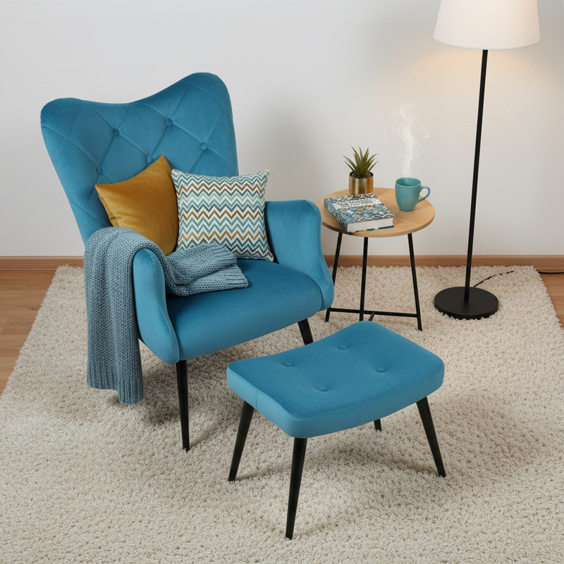 KRZESŁO FOTEL WELUROWY TAPICEROWANY Z PODNÓŻKIEM MARS TURKUSOWY NOGI CZARNE
