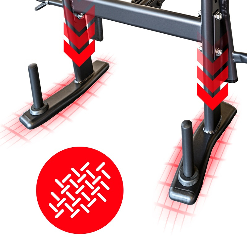 Stalowa rama malowana proszkowo oraz szeroka podstawa zapewniają odpowiednią stabilność podczas ćwiczeń, a maksymalne obciążenie do 320 kg gwarantuje bezpieczeństwo użytkowania.