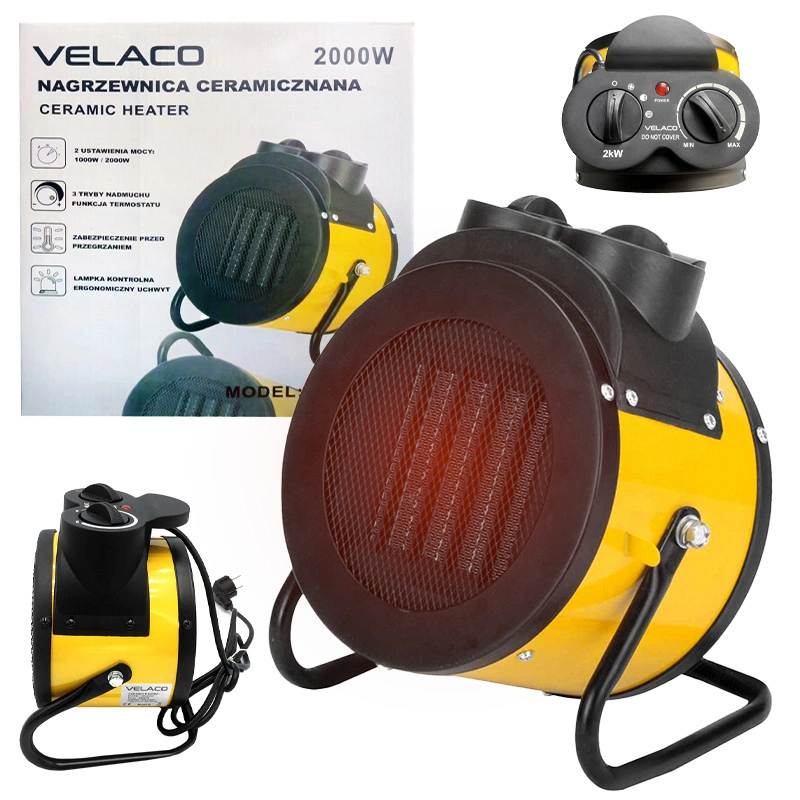 Nagrzewnica elektryczna Velaco to kompaktowe, przenośne źródło ciepła o mocy 2000 W, idealne do ogrzewania warsztatów, garaży, domów i sklepów. Wyposażona w termostat, pozwala na utrzymanie optymalnej temperatury, zapewniając jednocześnie oszczędność energii. Urządzenie jest bezpieczne dzięki zabezpieczeniu termicznemu aktywującemu się przy 68°C i samo-resetującemu się mechanizmowi. Oferuje trzy tryby pracy, umożliwiając dostosowanie mocy ogrzewania do potrzeb pomieszczenia. Ceramiczny element grzewczy i silny nawiew zapewniają efektywne i szybkie ogrzewanie z minimalnym poziomem hałasu, a proszkowa powłoka obudowy chroni przed korozją, zwiększając trwałość. To wydajne urządzenie jest wszechstronne i doskonale sprawdza się w różnych warunkach.