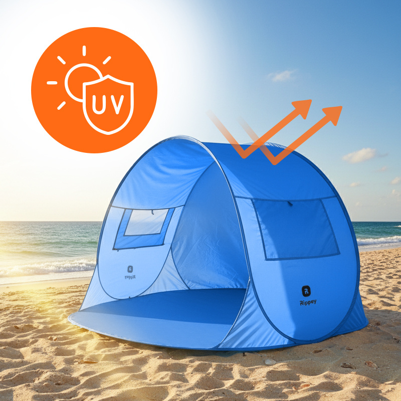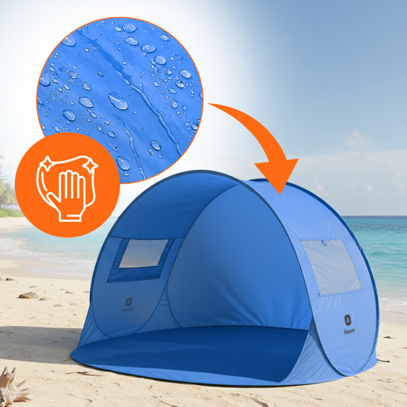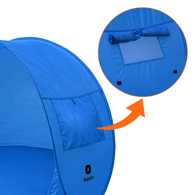 Dwa okienka w namiocie plażowym Sunset umożliwiają przepływ powietrza wewnątrz namiotu, co zapewnia świeże powietrze i pomaga uniknąć parowania. Dzięki temu można utrzymać przyjemny klimat wewnątrz namiotu, zwłaszcza podczas gorących dni na plaży lub podczas upalnych nocnych temperatur na kempingu.
