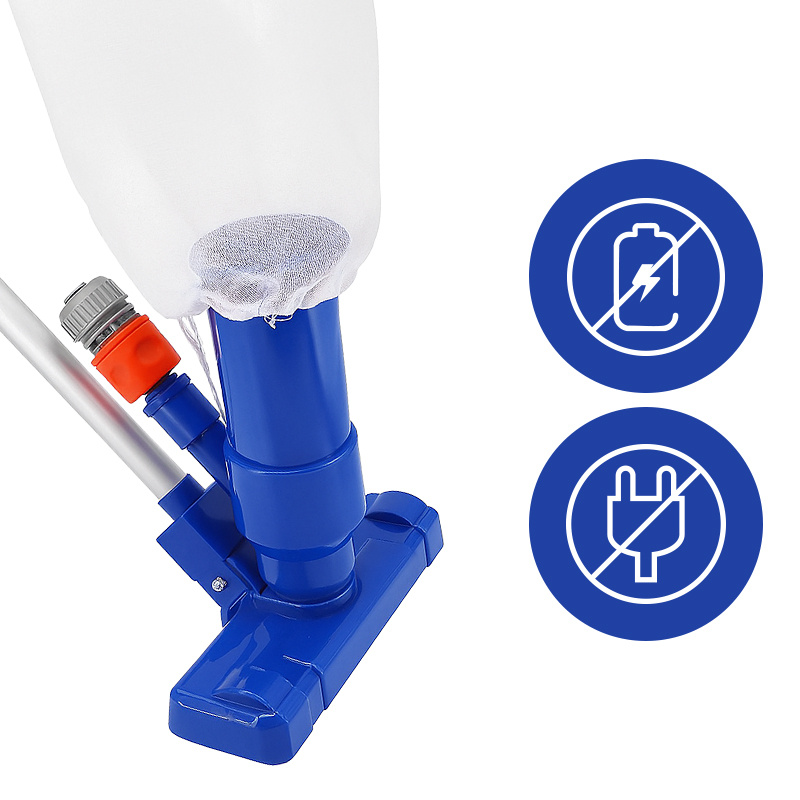 Szczotka nie wymaga podłączenia do pompy basenowej. Wystarczy podłączyć zwykły wąż ogrodowy – strumień wody wprowadzany pod ciśnieniem unosi zanieczyszczenia z dna i wypycha je ku górze, gdzie trafiają do siatki zamocowanej w górnej części szczotki. Tam się zbierają, co umożliwia ich łatwe usunięcie po zakończeniu pracy.