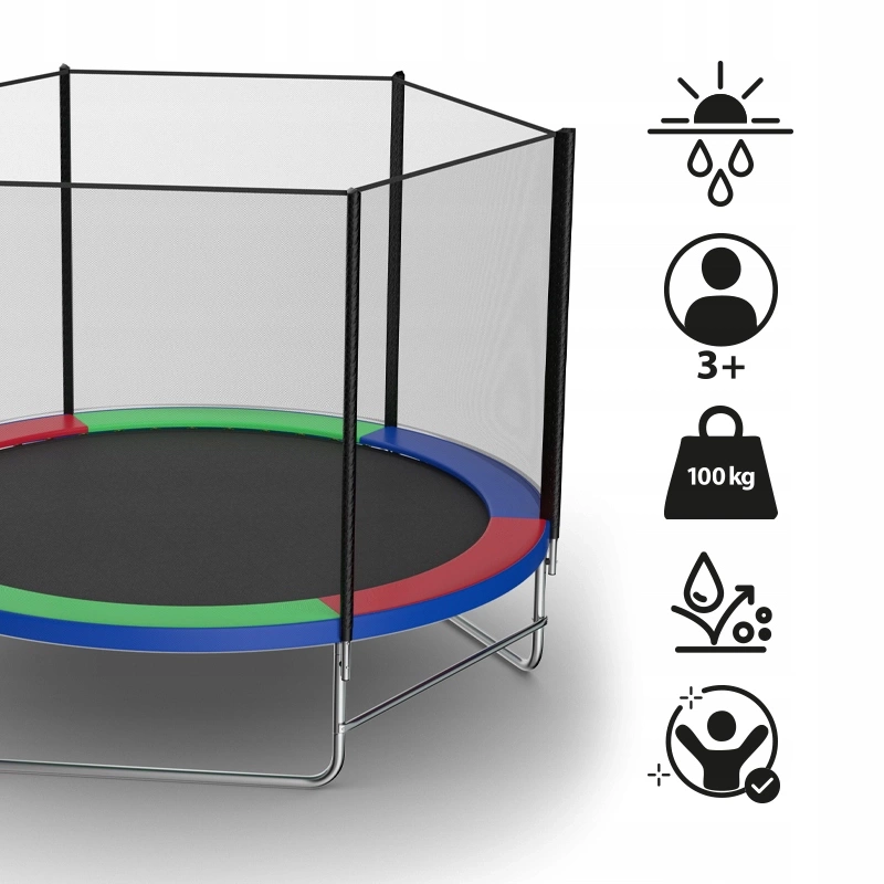 Dzięki wytrzymałym materiałom, piankowym okładzinom słupków oraz maty ochronnej, trampolina jest odporna na działanie czynników atmosferycznych oraz promieniowanie UV. Nie musisz się martwić o przyspieszone zużycie urządzenia czy jego niszczenie pod wpływem niekorzystnych warunków pogodowych.