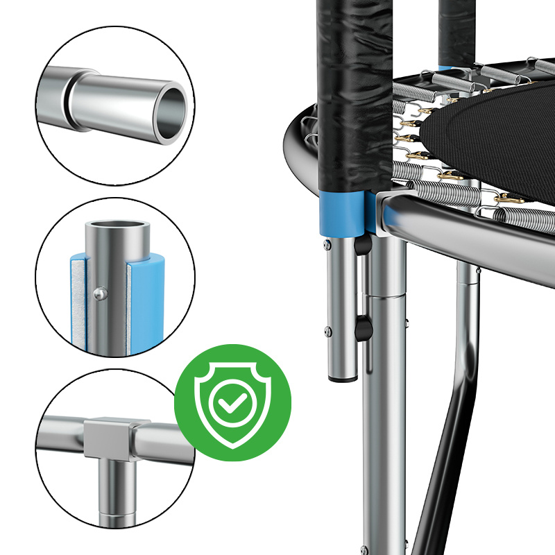 Trampoliny marki RevoGym produkowane są z grubych, ocynkowanych materiałów stalowych o średnicy FI 38 i grubości 1,1 mm. Konstrukcja jest wzmocniona, co zapewnia jej odporność na znaczne przeciążenia w trakcie zabawy dzieci..