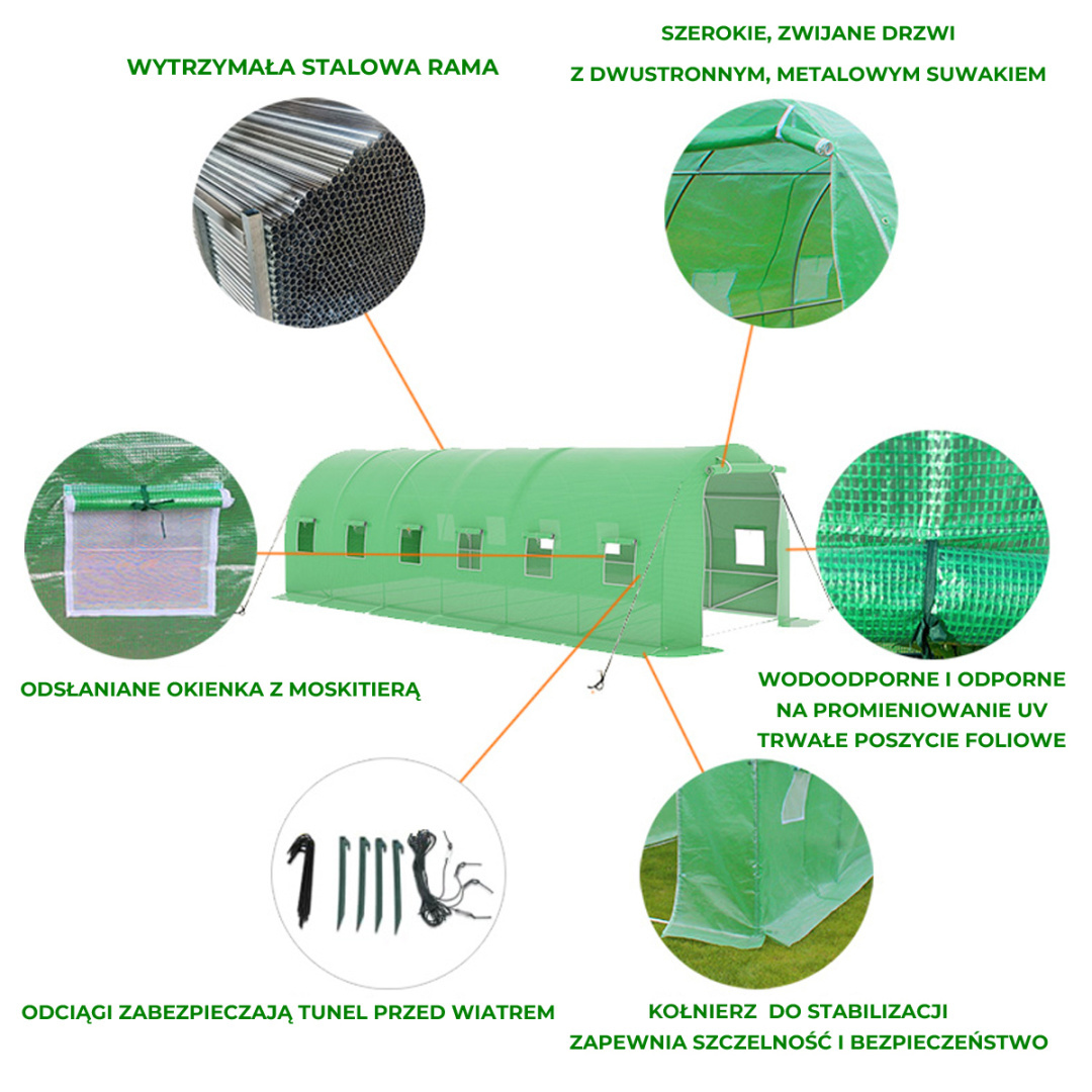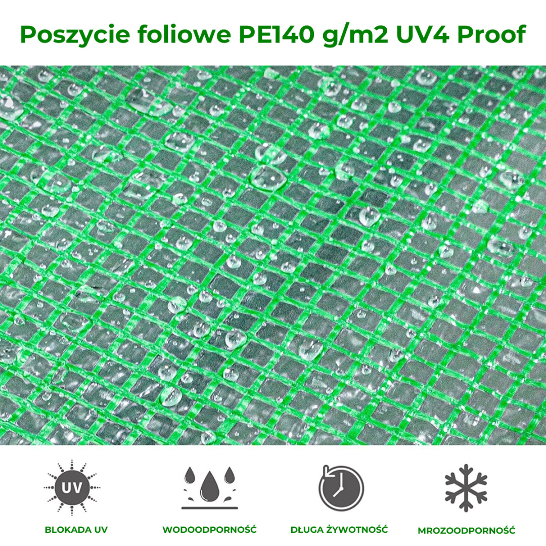 • Poszycie foliowe PE140 g/m2 UV4 Proof (odporne na promieniowanie UV),kołnierz o wielkości 25 cm