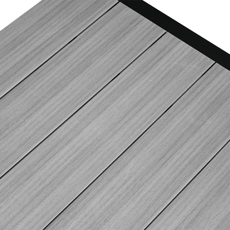 Zarówno blat stolika, jak i podłokietniki foteli i sofy zostały wykończone elementami z trwałego tworzywa imitującym naturalne drewno. To nie tylko funkcjonalne rozwiązanie (odporne na wilgoć i łatwe w czyszczeniu), ale też estetyczny detal, który ociepla surową konstrukcję i dodaje całości elegancji.
