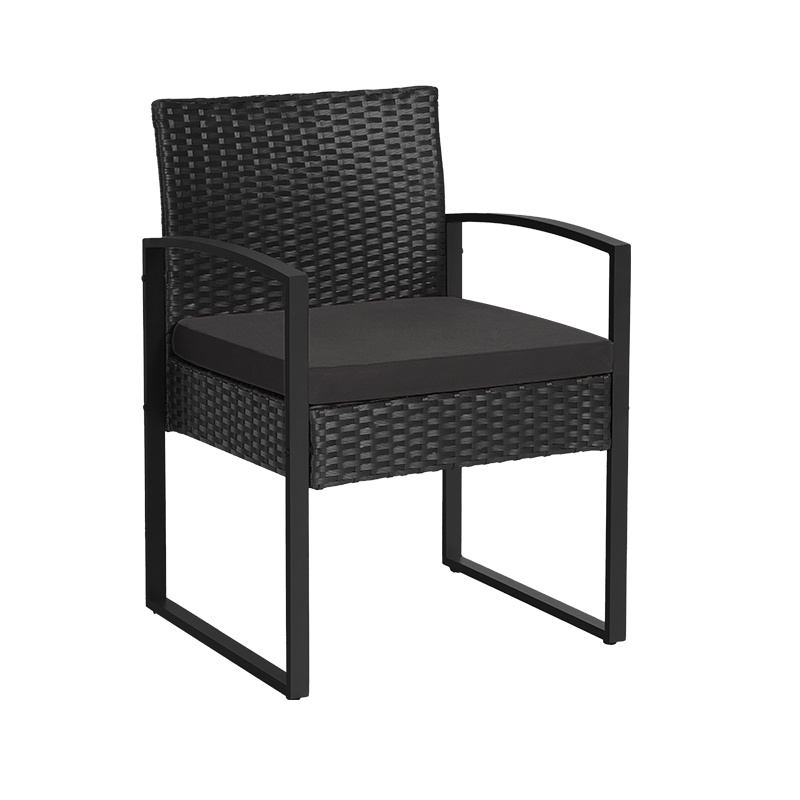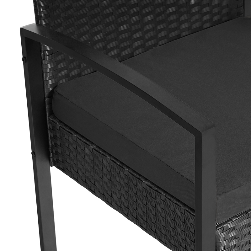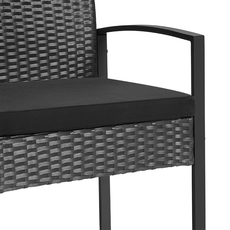 Elegancki antracytowy kolor rattanu w połączeniu z czarnymi poduszkami i ciemnym, szklanym blatem dodaje nowoczesności i klasy każdemu tarasowi, ogrodowi czy balkonowi.