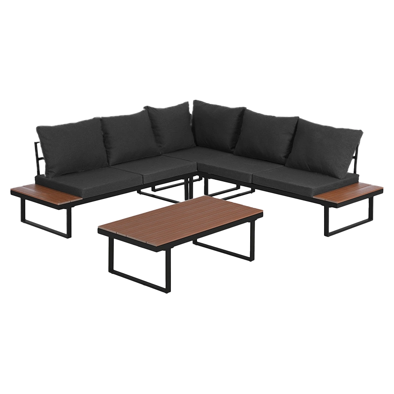 Praktyczny stolik kawowy oraz boczne panele przy siedziskach zostały wykonane z trwałego tworzywa w kolorze naturalnego drewna. Elementy te nie tylko pełnią funkcję użytkową – jako miejsce na napoje, książki czy dekoracje – ale też wizualnie ocieplają industrialną formę zestawu, wprowadzając równowagę między surowością metalu a estetyką drewna.